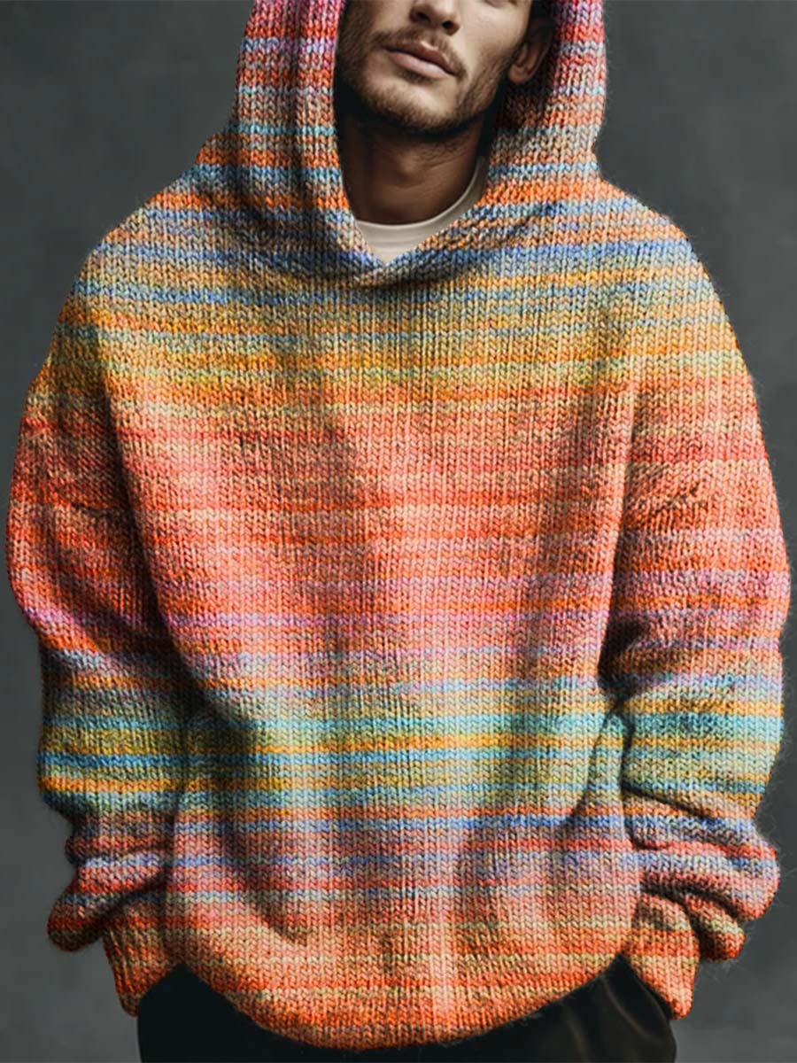 Color Gradient Vintage Stripes Print Casual Knitted Hoodie Sweater
