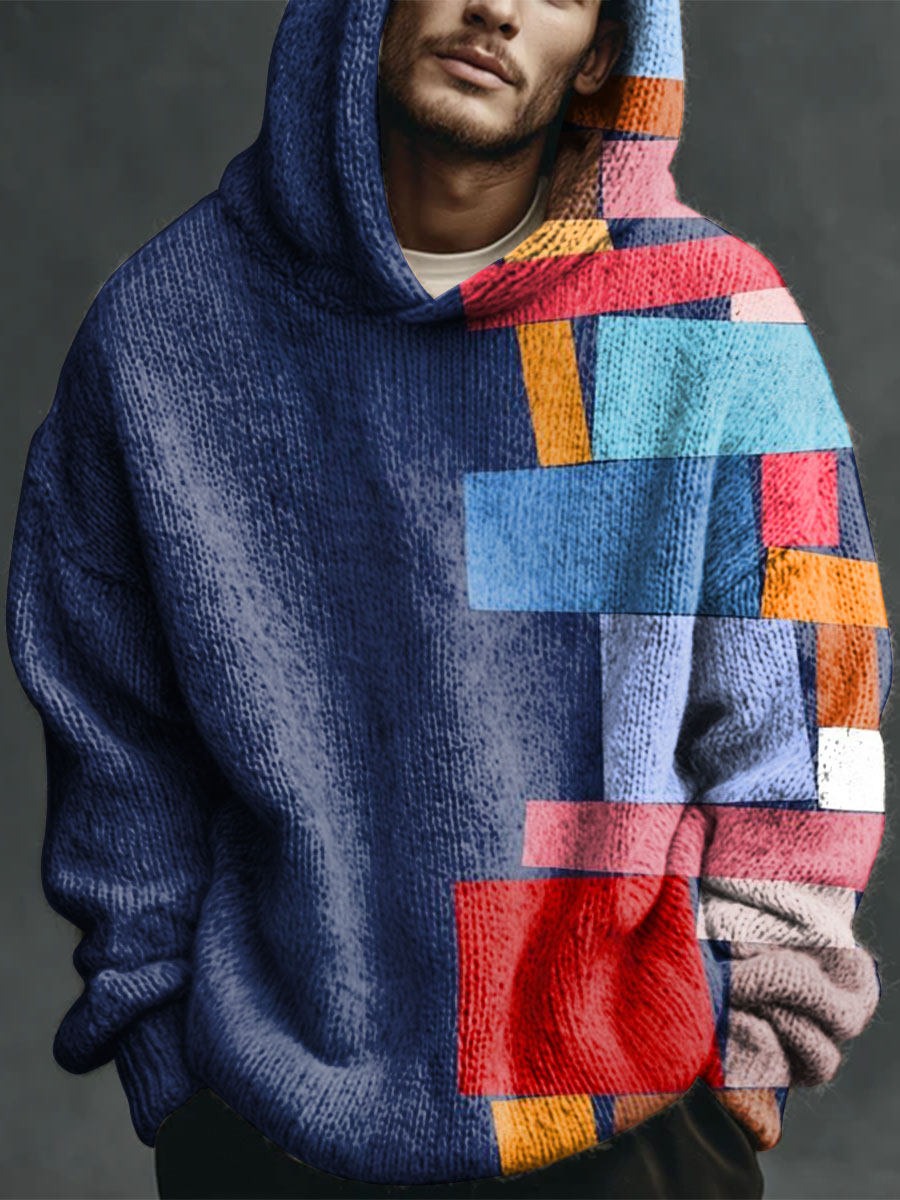 Colorful Geometric Mosaic Print Casual Knitted Hoodie Sweater