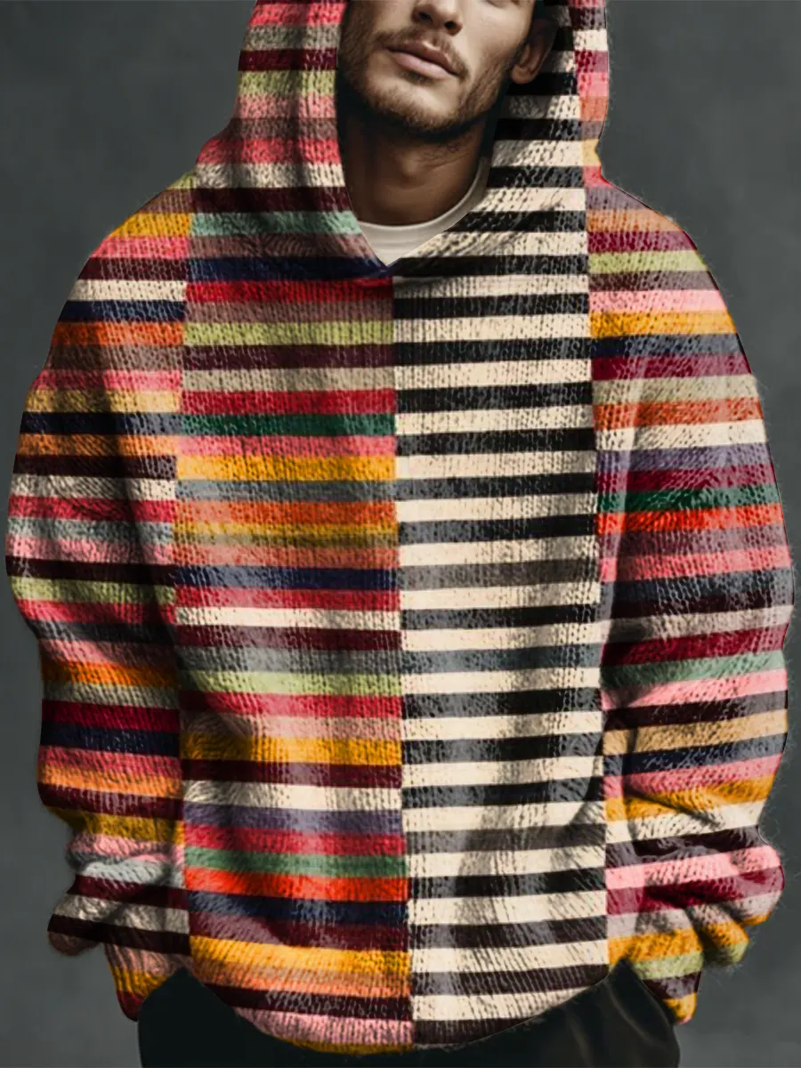 Retro Multicolored Stripes Art Print Casual Knitted Hoodie Sweater